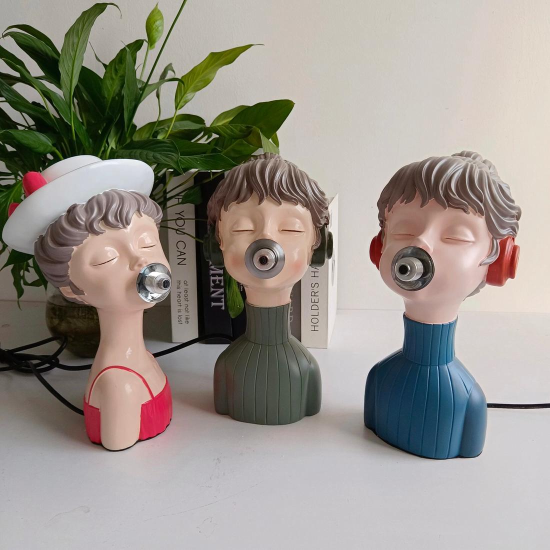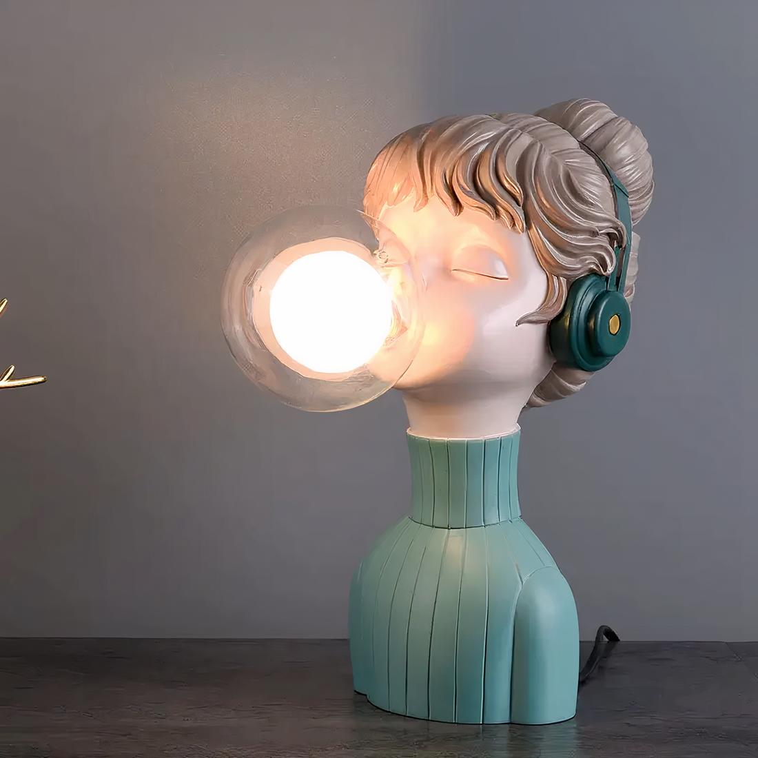 Plongez dans l'univers artistique avec notre lampe de chevet en résine représentant le buste gracieux d'une jeune fille émettant des bulles de chewing-gum, symbolisées par l'ampoule.